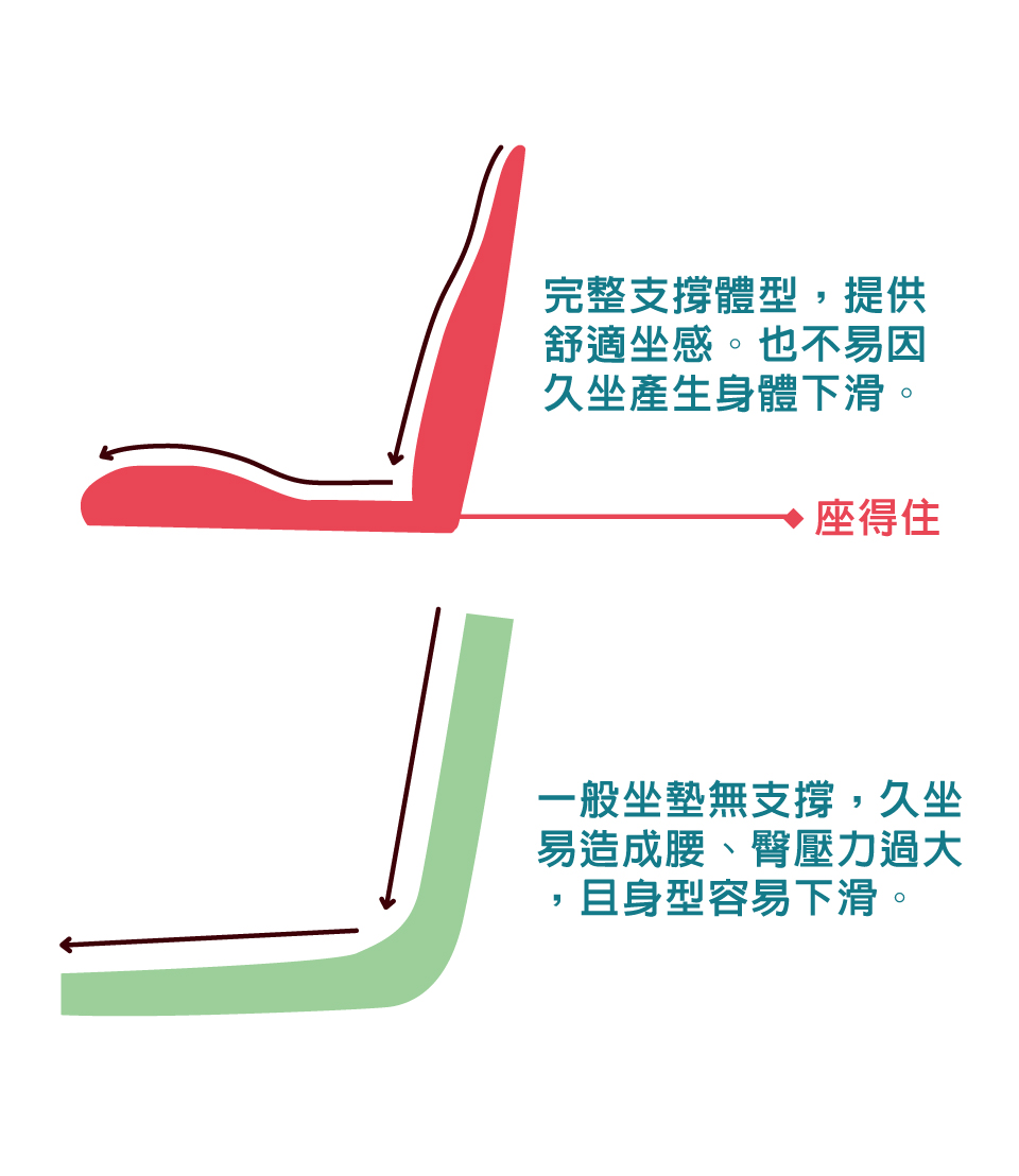 ➤ 首創完整支撐曲面坐墊,完整服貼腰、臀、腿,舒適支撐身型
