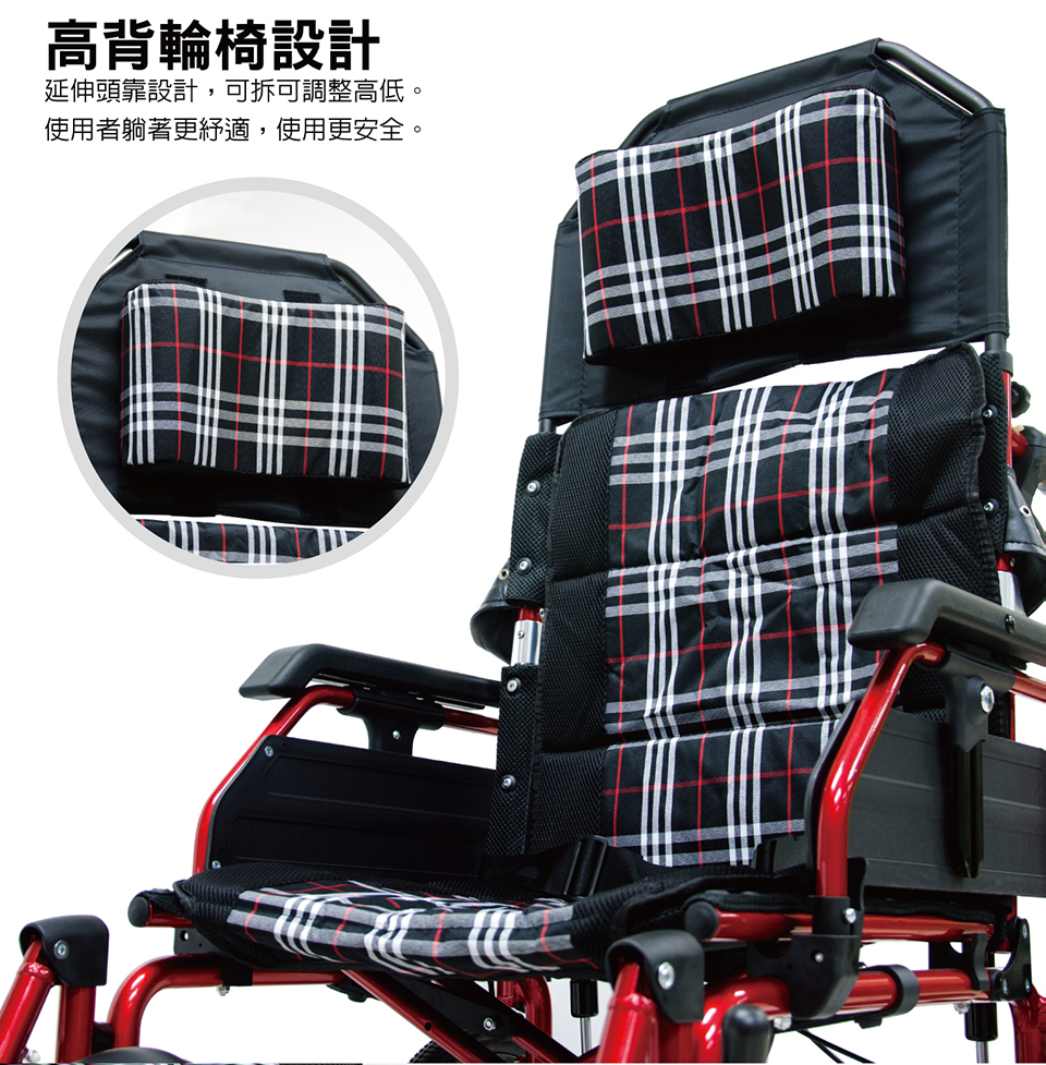 ➤ 高背輪椅設計,延伸頭靠,可拆可調整高低,使用者躺著更舒適安全