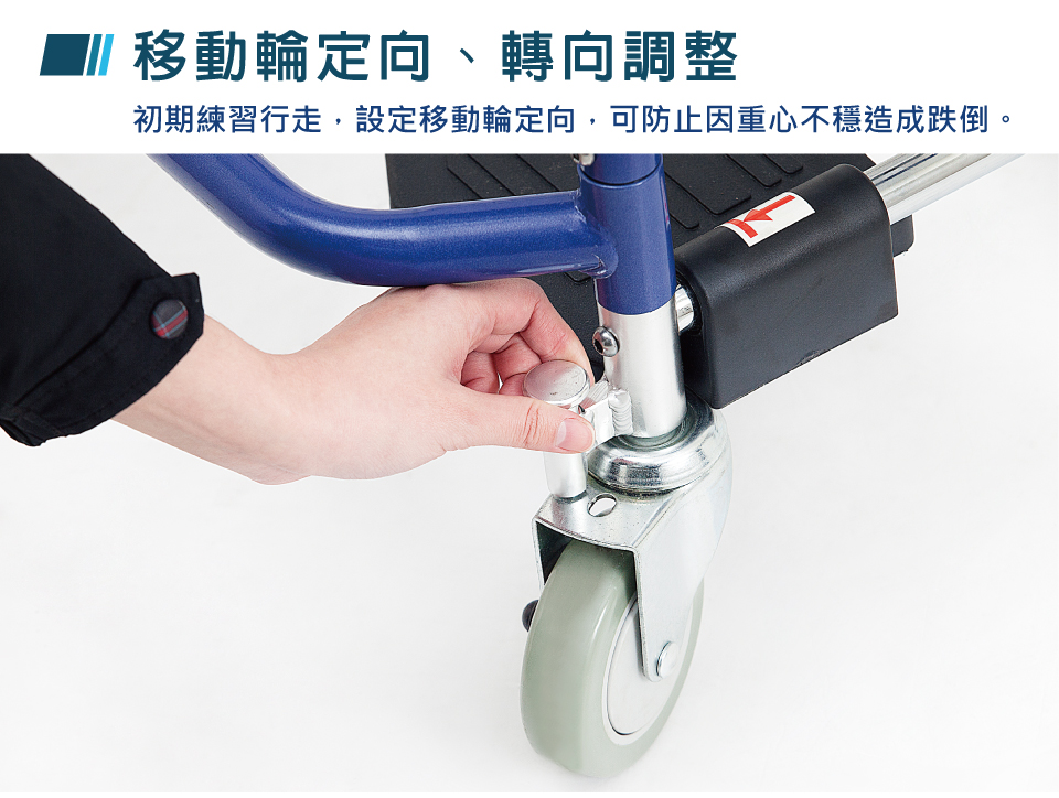 ➤ 移動輪定向、轉向調整,初期練習行走,設定移動輪定向,可防止因重心不穩