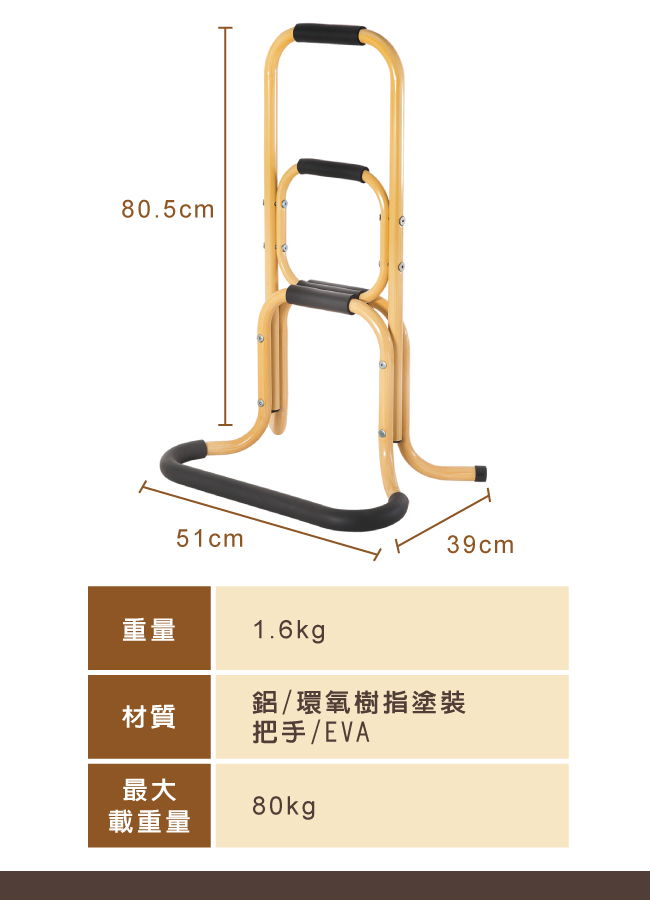 3.可適用於玄關高低差之扶手,或可當作座騎、榻榻米、床上起身扶手、馬桶起身扶手。